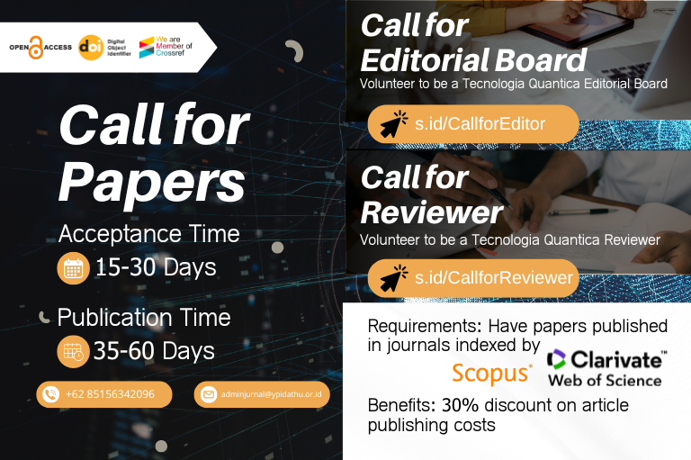 Journal of Tecnologia Quantica is dedicated to bringing together the latest and most important results and perspectives from across the emerging field of quantum science and technology. Journal of Tecnologia Quantica is a highly selective journal; submissions must be both essential reading for a particular sub-field and of interest to the broader quantum science and technology community with the expectation for lasting scientific and technological impact. We therefore anticipate that only a small proportion of submissions to Journal of Tecnologia Quantica will be selected for publication. We feel that the rapidly growing Journal of Tecnologia Quantica community is looking for a journal with this profile, and one that together we can achieve. Submitted papers must be written in English for initial review stage by editors and further review process by minimum two international reviewers.