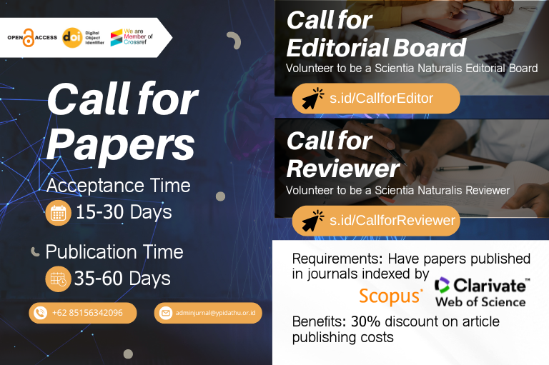 Research of Scientia Naturalis is an international forum for the publication of peer-reviewed integrative review articles, special thematic issues, reflections or comments on previous research or new research directions, interviews, replications, and intervention articles - all pertaining to the research fields of Mathematics and Natural Sciences. All publications provide breadth of coverage appropriate to a wide readership in Mathematics and Natural Sciences research depth to inform specialists in that area. We feel that the rapidly growing Research of Scientia Naturalis community is looking for a journal with this profile that we can achieve together. Submitted papers must be written in English for initial review stage by editors and further review process by minimum two international reviewers.